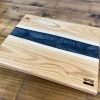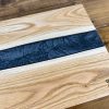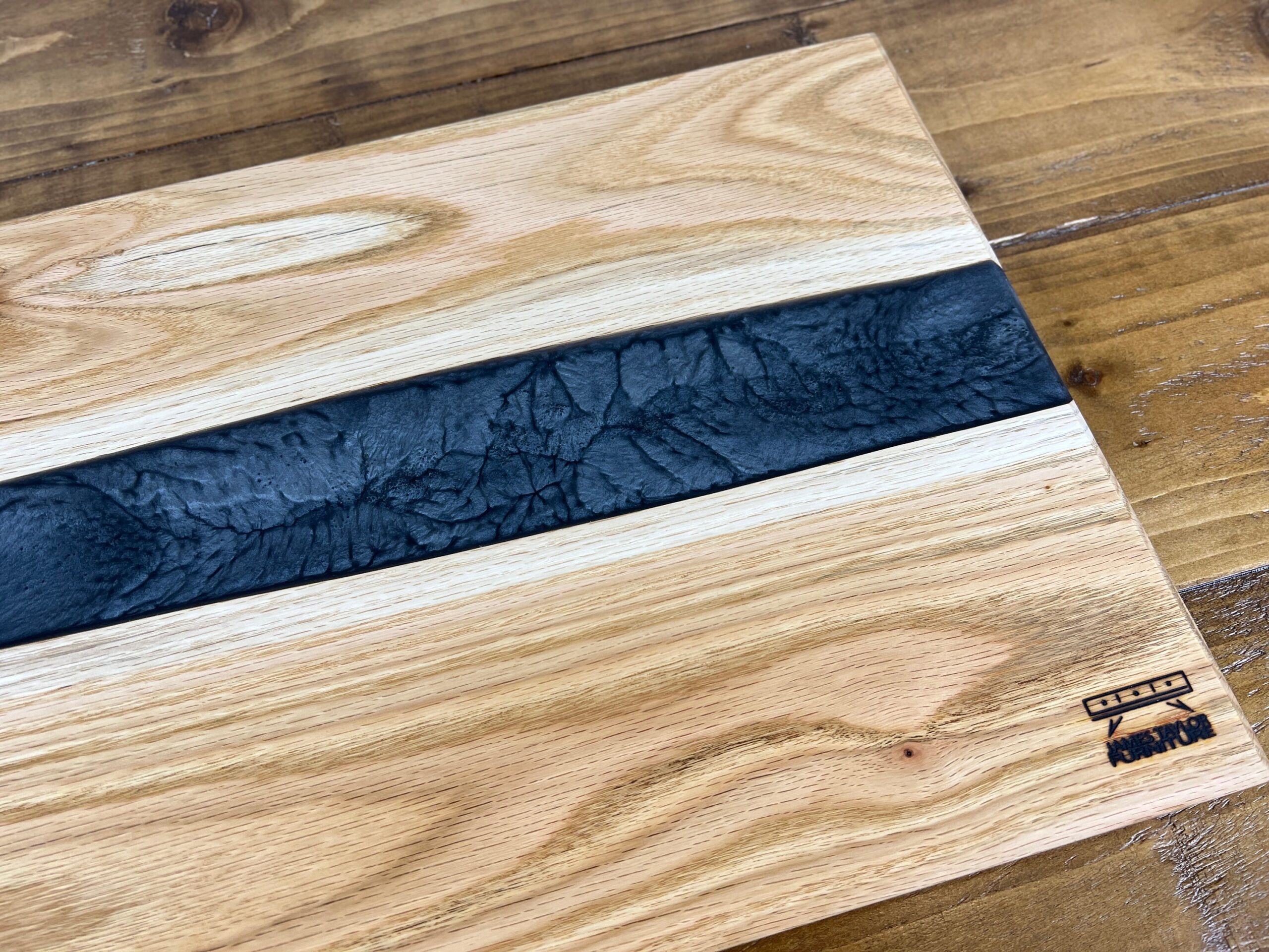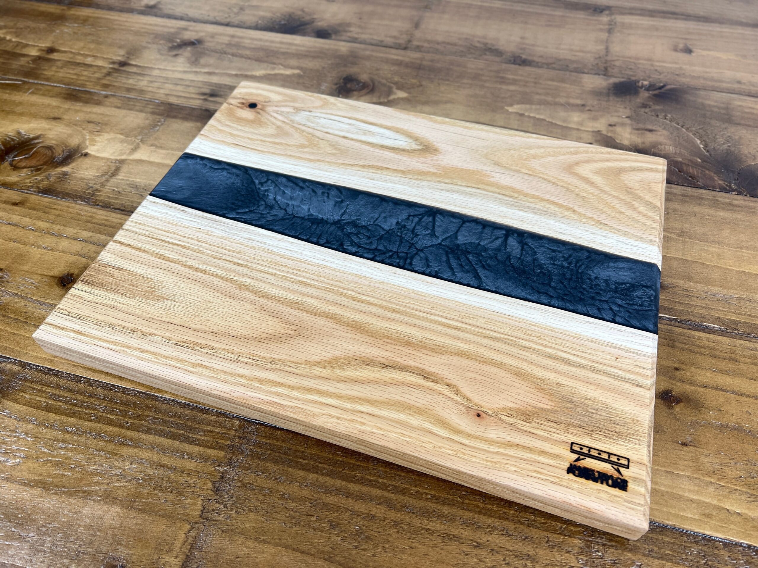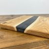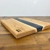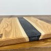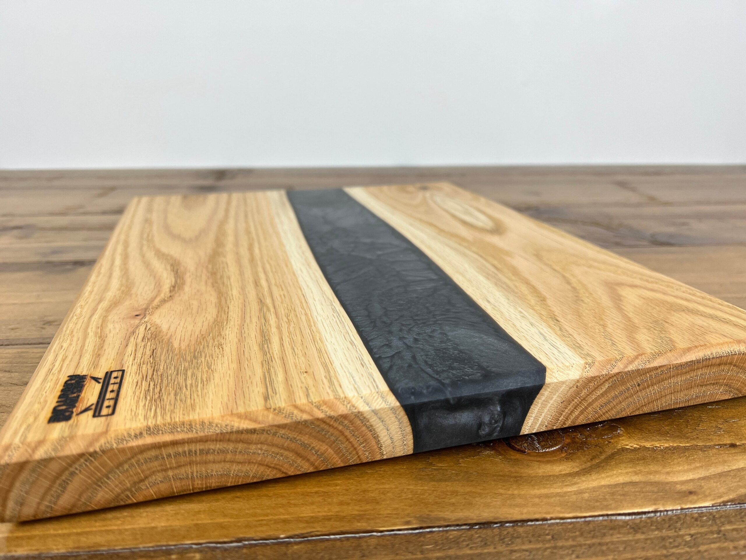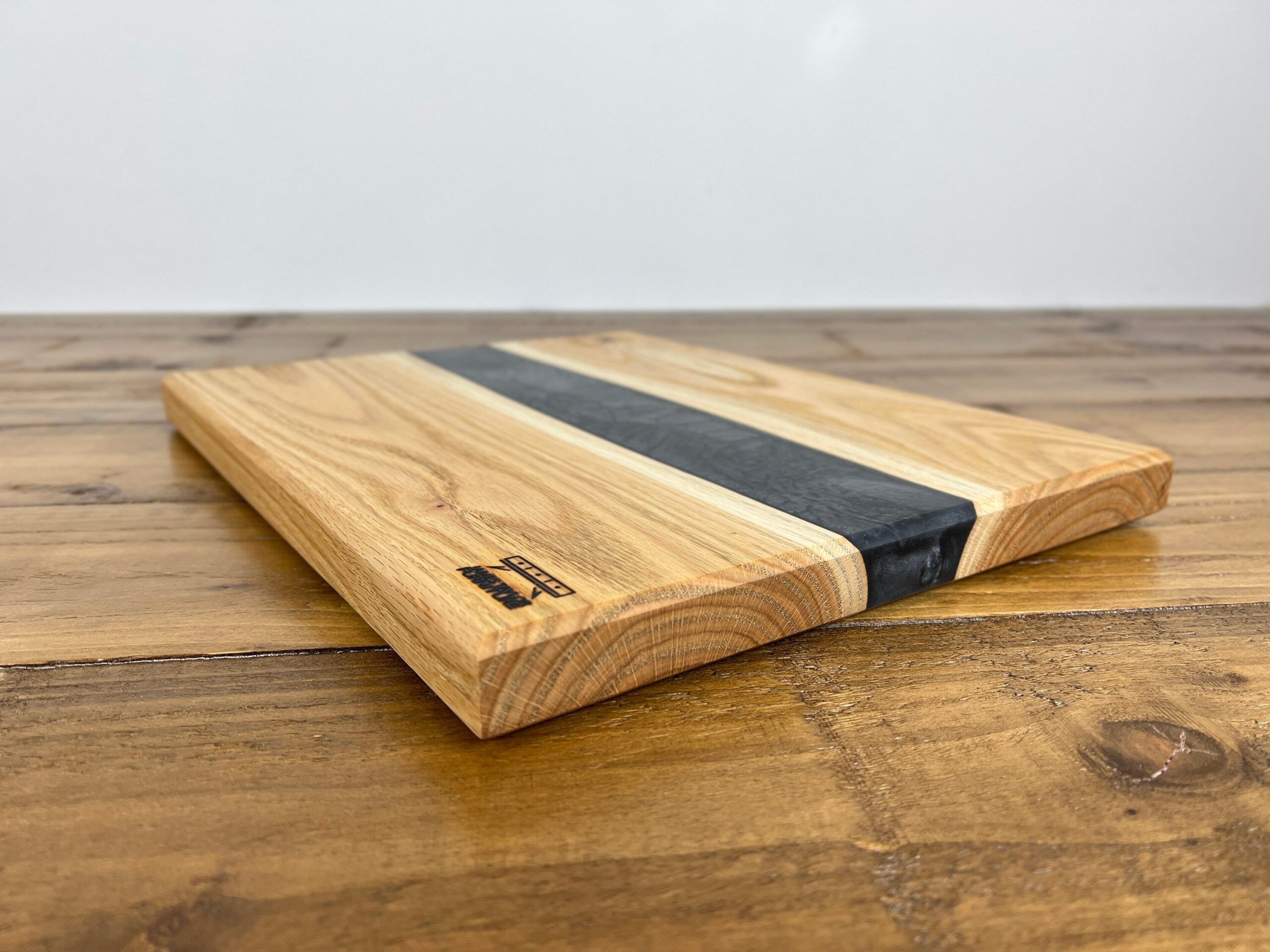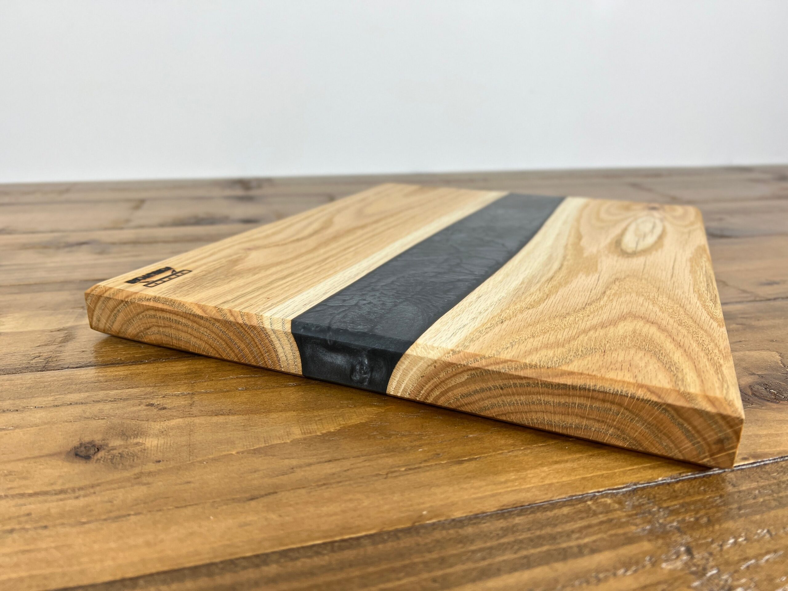 A very unique board made from live edge English Ash and Smokey Grey epoxy resin. This board is one of a kind due to the natural flow pattern of the epoxy being impossible to replicate alongside the live edge Ash following the natural growth shape of the tree. Finished with a food safe, natural wax-oil to make the natural grain and colour of the wood and epoxy standout whilst providing a tough protective layer to preserve the boards usable life. The board is thick and heavy to prevent it sliding around in use.