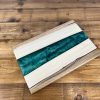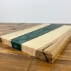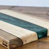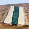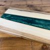 A very unique board made from live edge English Walnut and Green epoxy resin. This board is one of a kind due to the natural flow pattern of the epoxy being impossible to replicate alongside the live edge Walnut following the natural growth shape of the tree. Finished with a food safe, natural wax-oil to make the natural grain and colour of the wood and epoxy standout whilst providing a tough protective layer to preserve the boards usable life. The board is thick and heavy to prevent it sliding around in use.